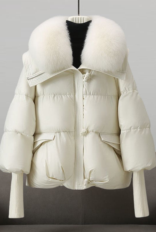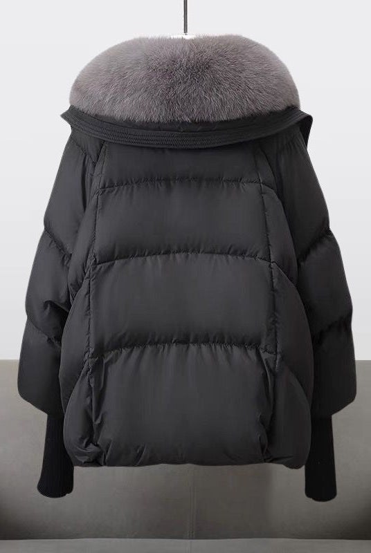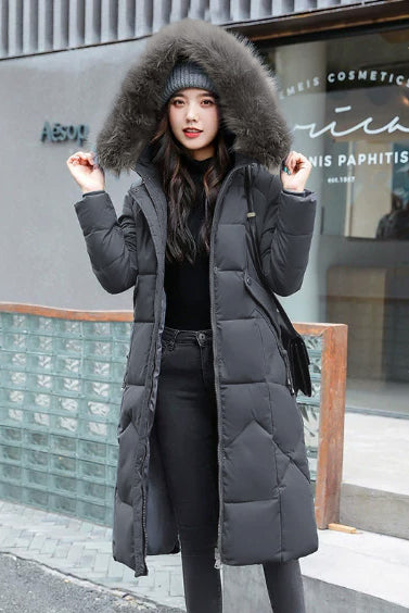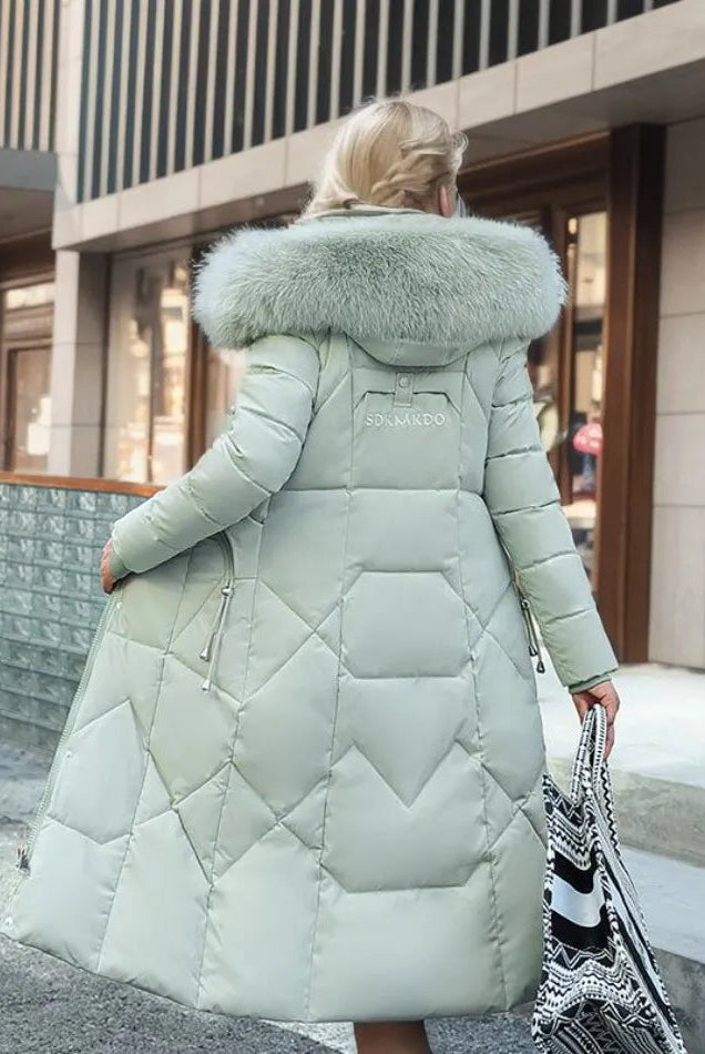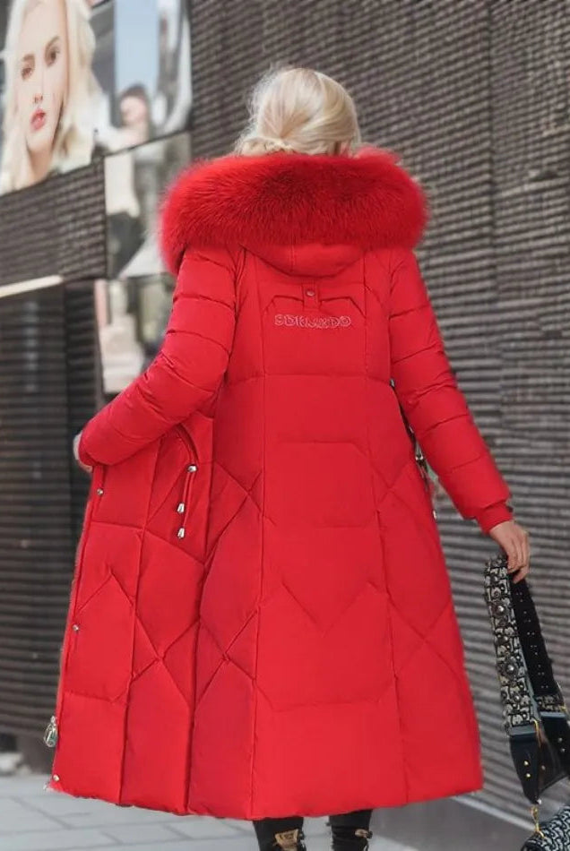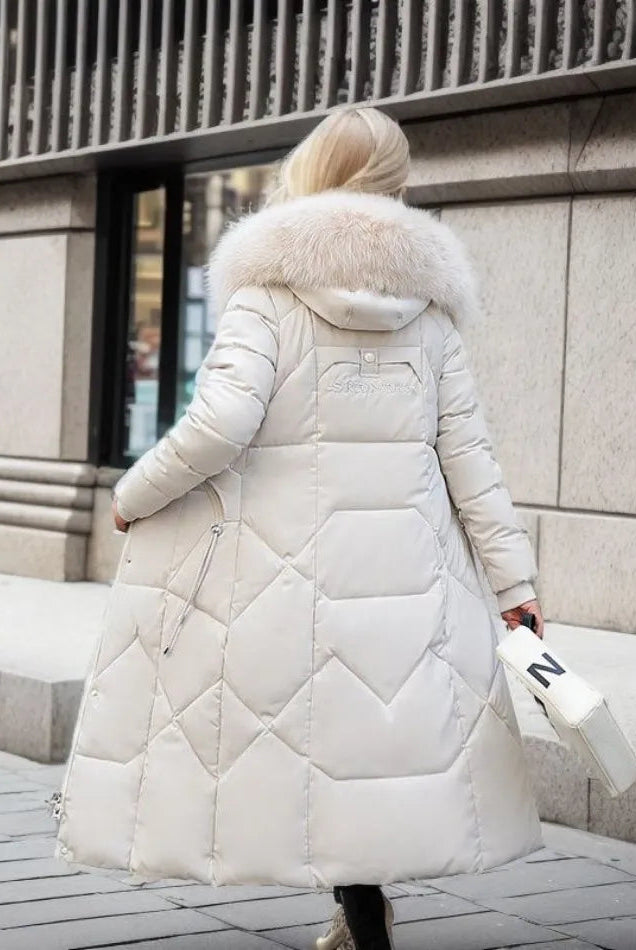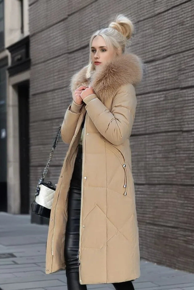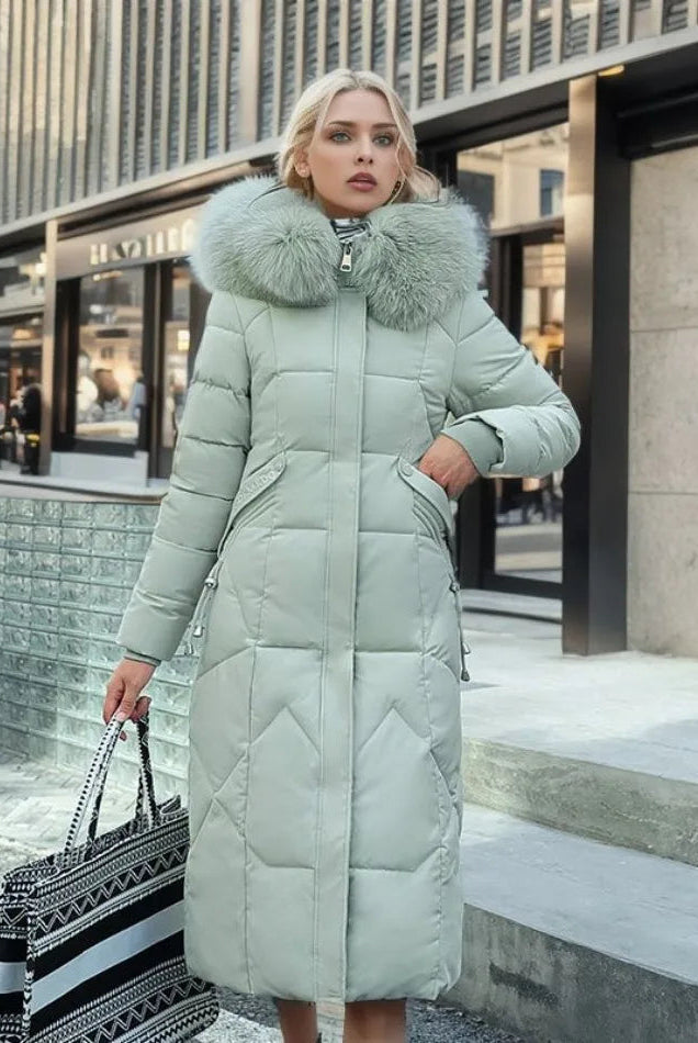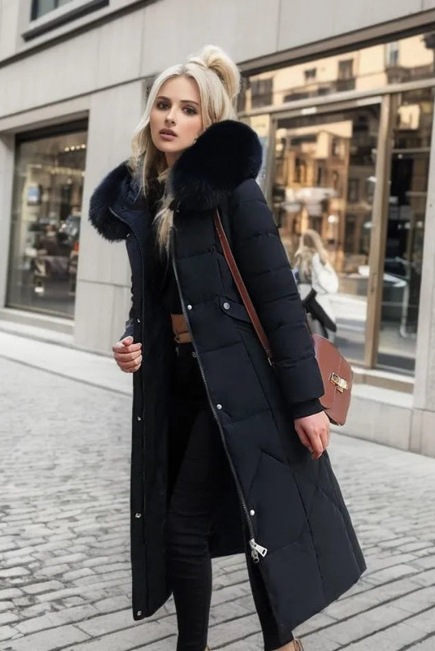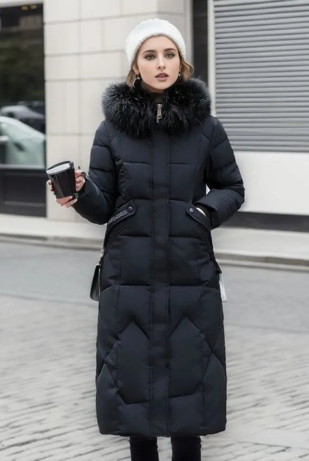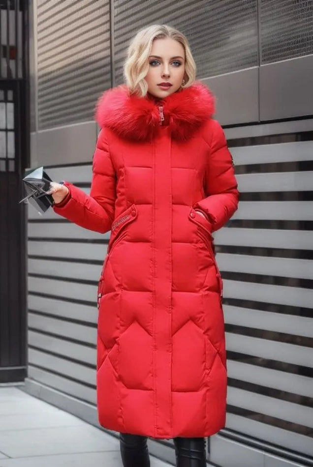 Damski Płaszcz Puchowy Zimowy Maxi - Kaptur i Ozdobne Wykończenie Kołnierza