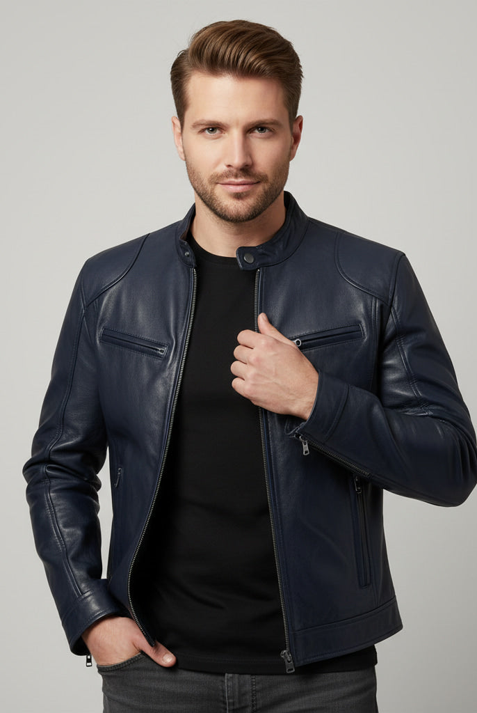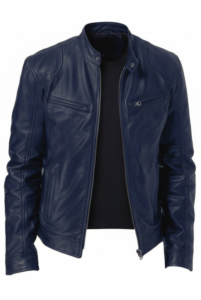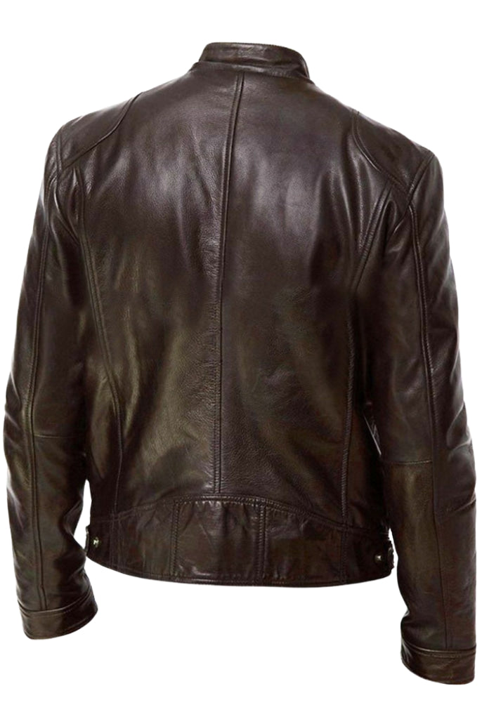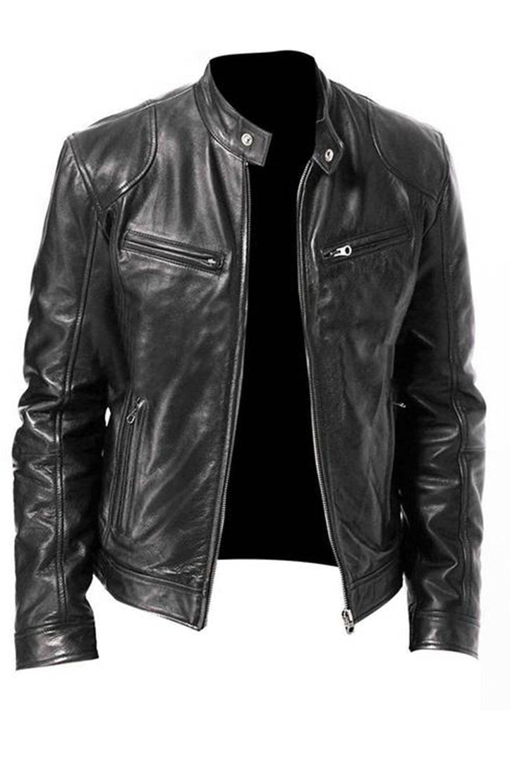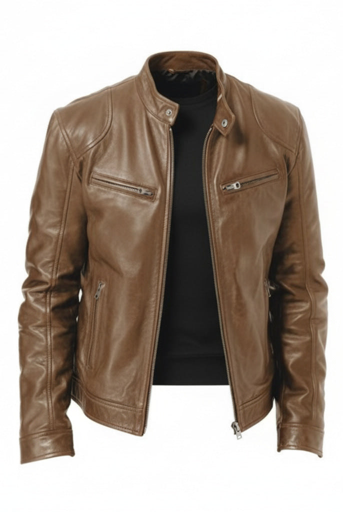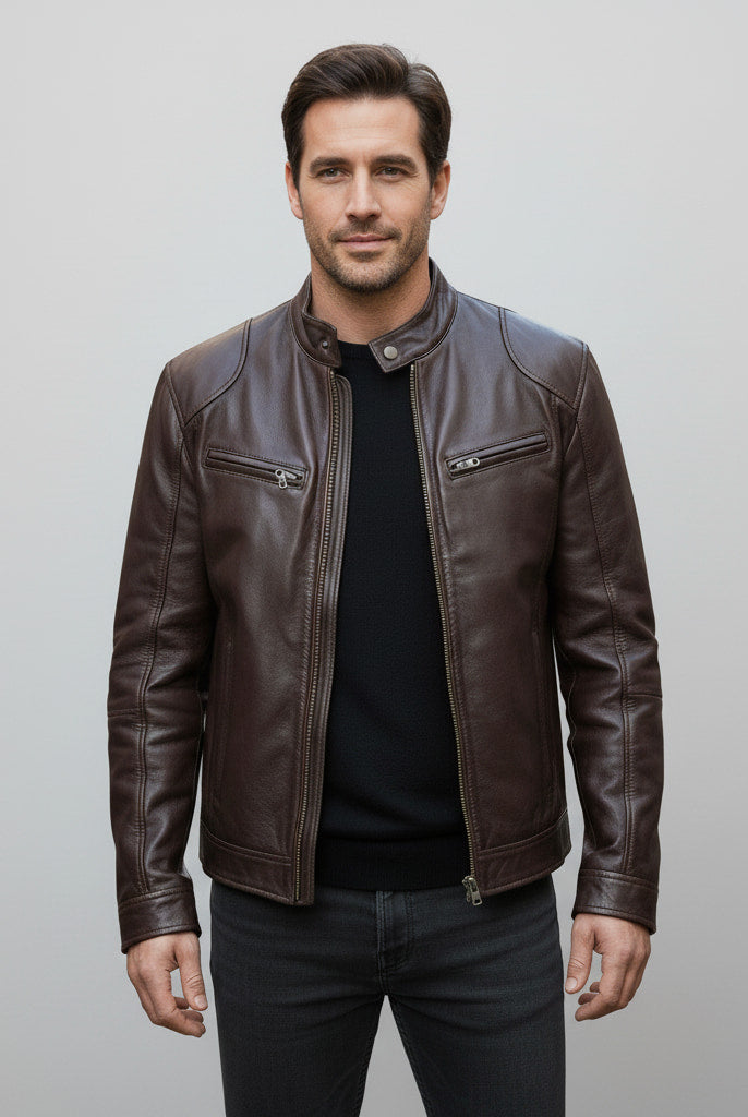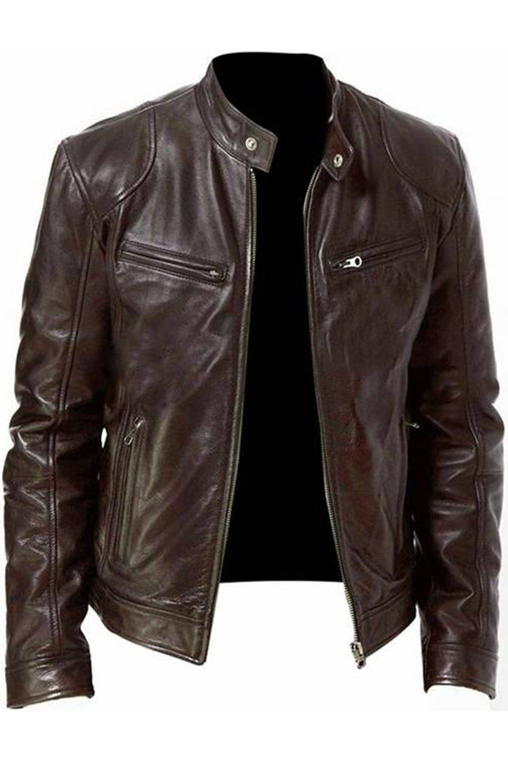 Męska Skórzana Kurtka Ramoneska - Ze Stójką, Zapinana na Zamek