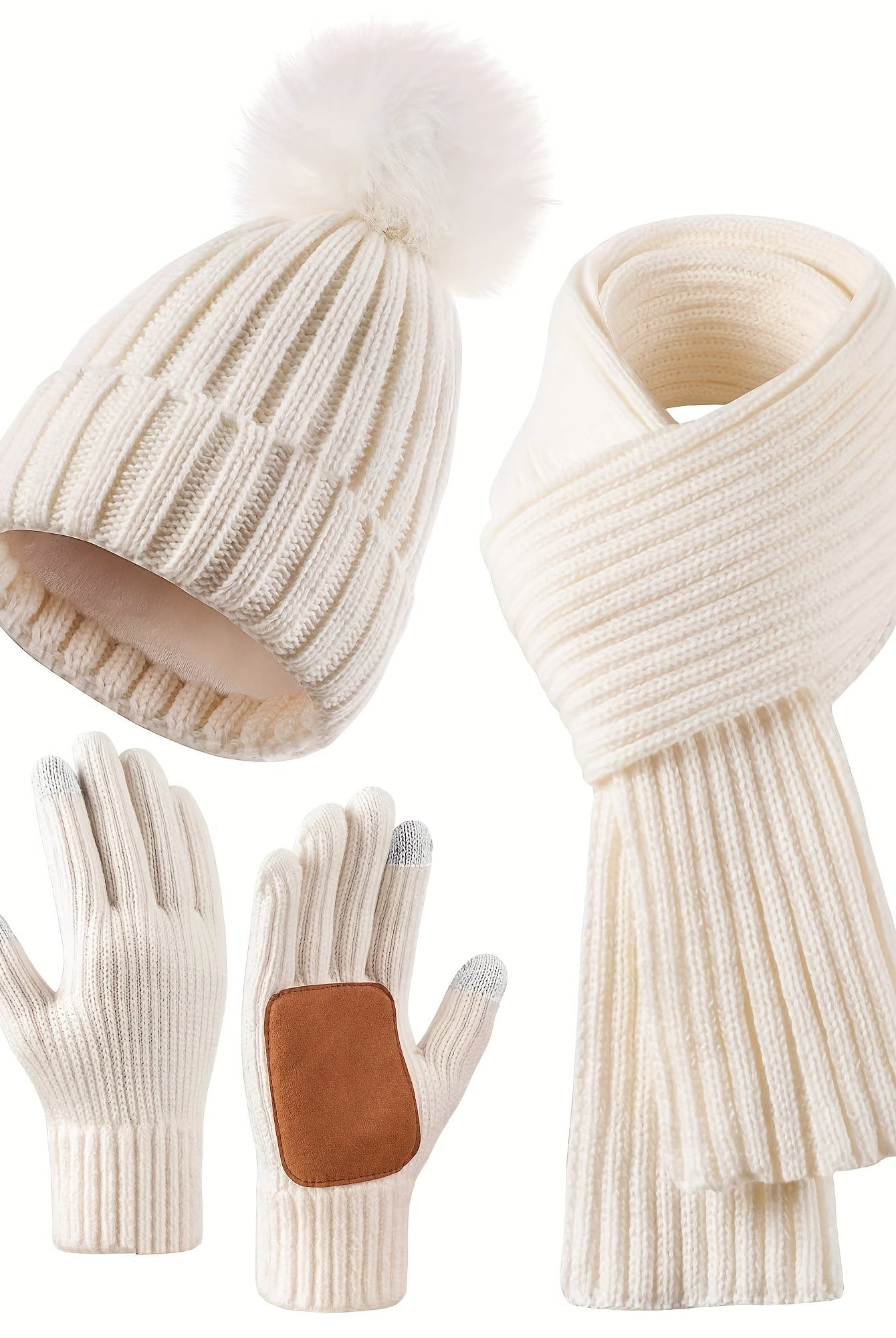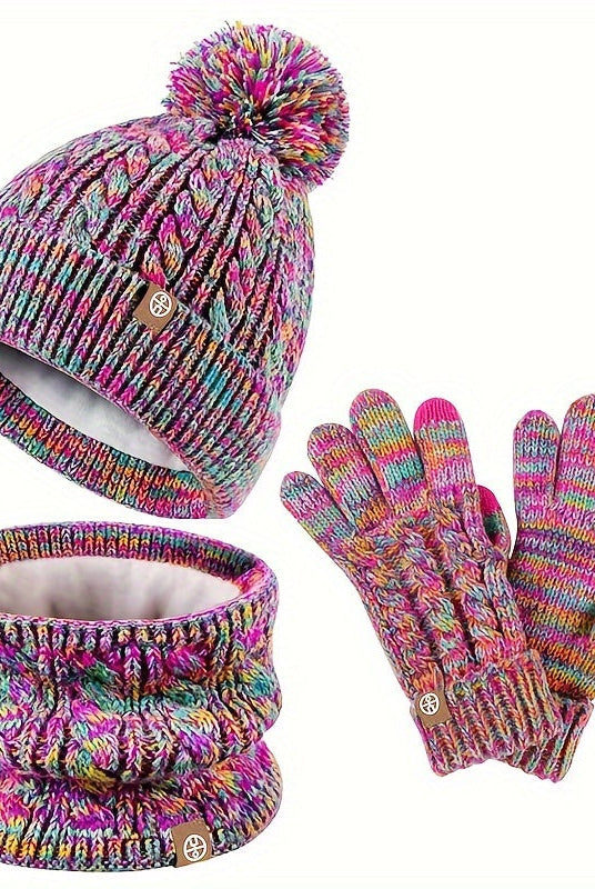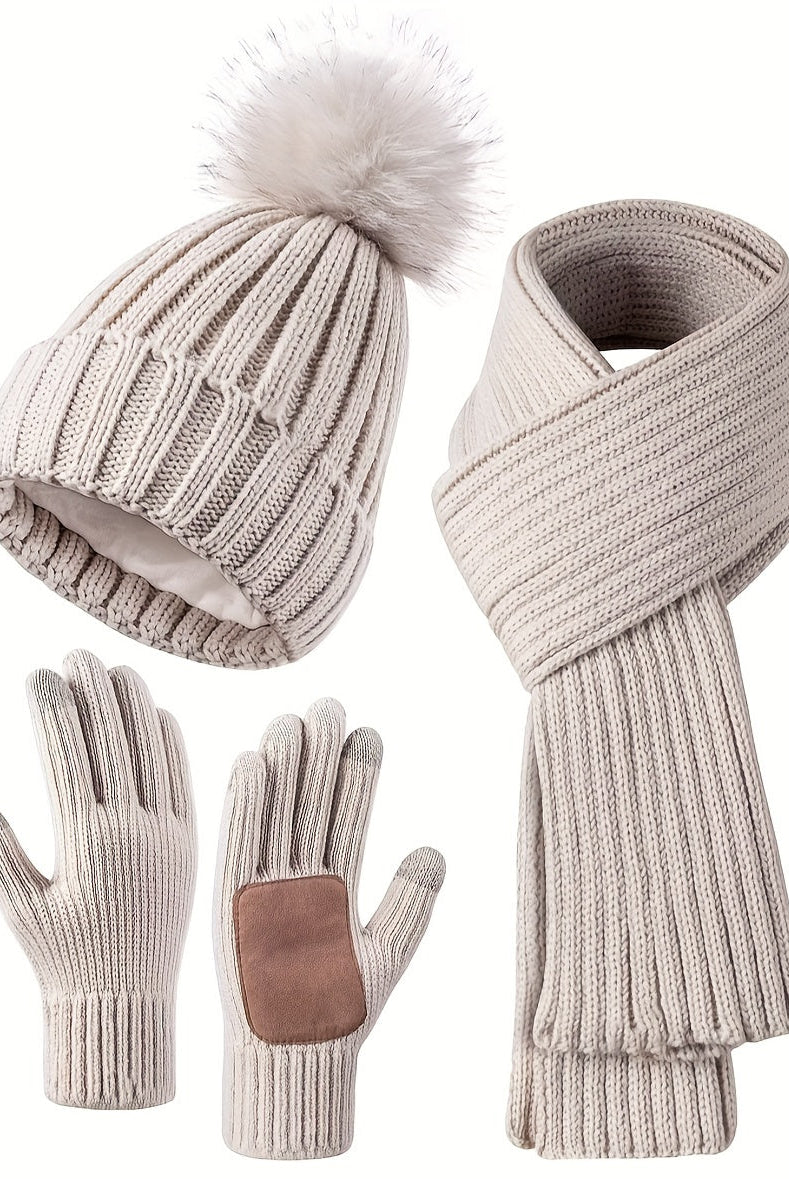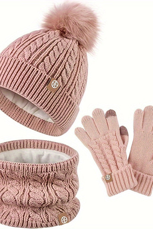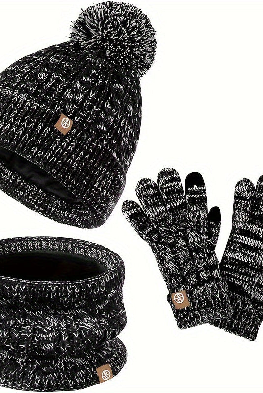 Damski Dziergany Zestaw Zimowy 3w1 - Czapka Z Pomponem, Szalik i Rękawiczki Dotykowe