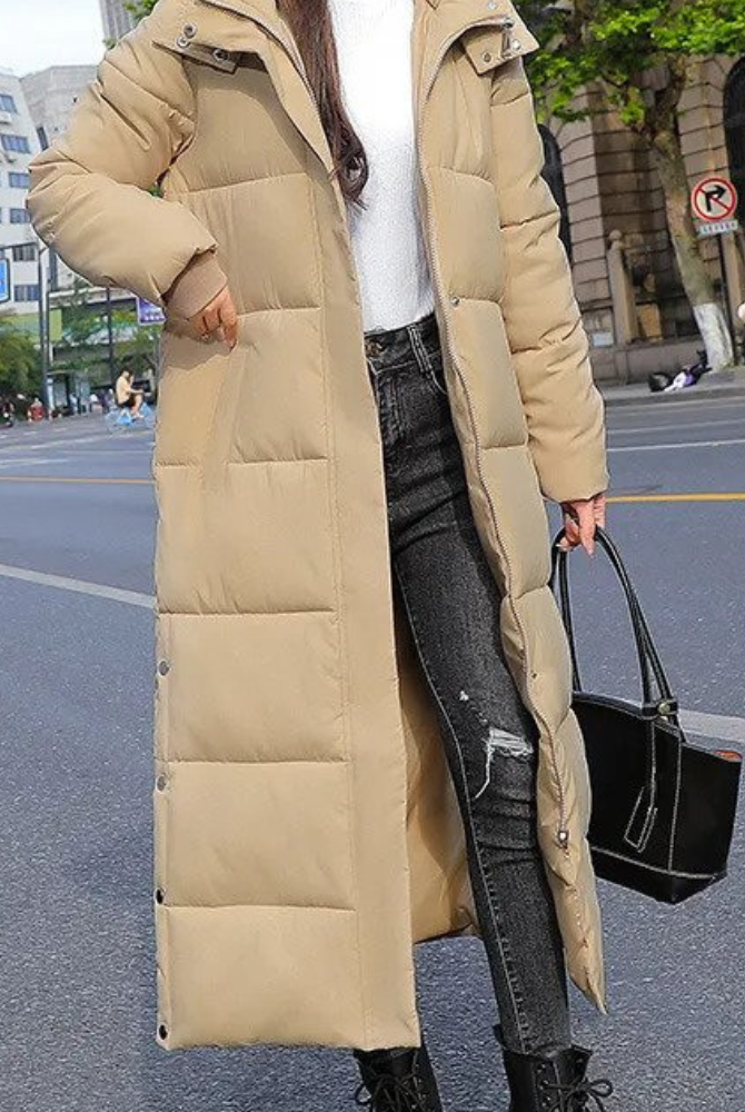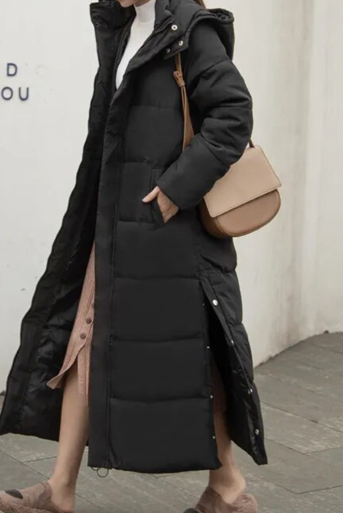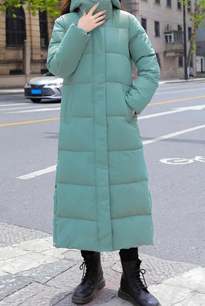 Damski Długi Płaszcz Puchowy Maxi - Z Wysokim Kołnierzem i Kapturem