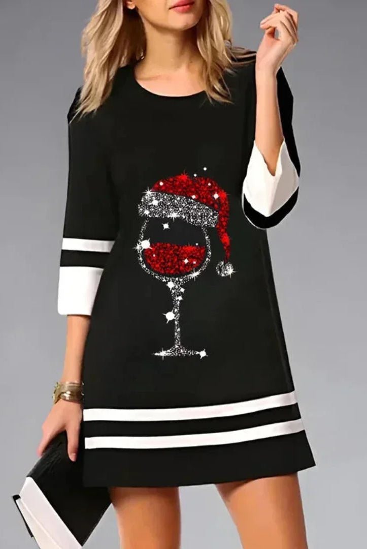 Damska Sukienka Świąteczna Mini - Rękawem 3/4 w Kontrastowym i Świąteczna Grafika