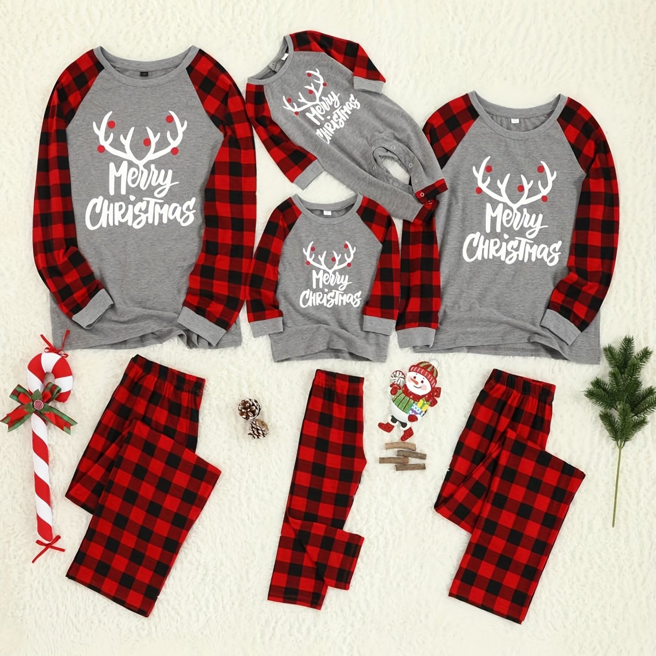 Unisex Komplet Piżam Rodzinnych Czerwony Boże Narodzenie - Wzór Kraty i Renifer