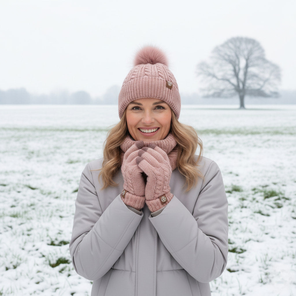 Damski Zestaw Zimowy 3w1 Z Warkoczowym Splotem - Czapka Z Pomponem, Komin i Rękawiczki Dotykowe