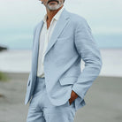 Męski Lniany Garnitur – Marynarka z Klapami Otwartymi i Pasujące Spodnie