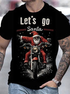 Męska Czarna Krótki Rękaw Koszulka Świąteczna - Wzór Mikołaj na Motorze
