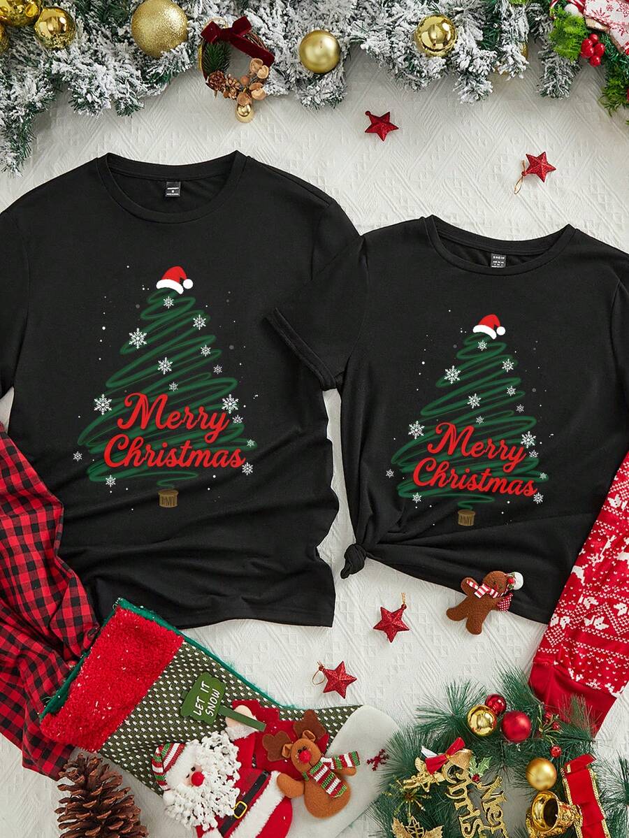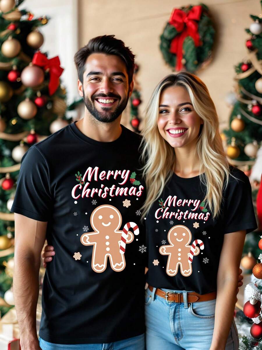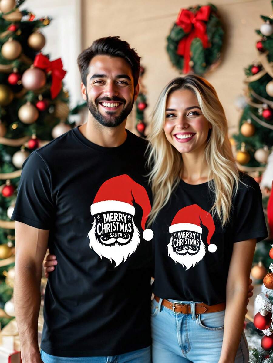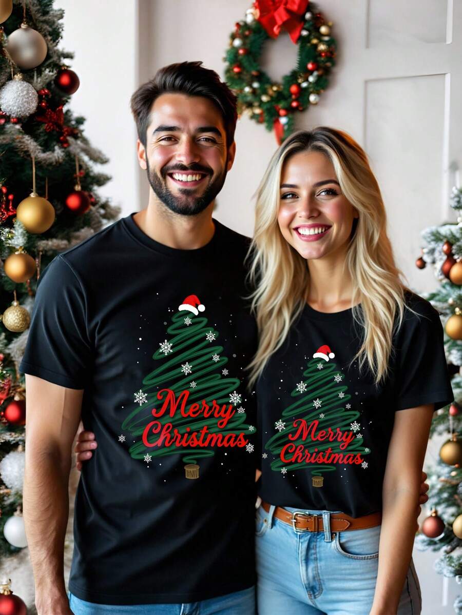 Unisex Czarna Koszulka Świąteczna - Krótki Rękaw z Motywem Świątecznym