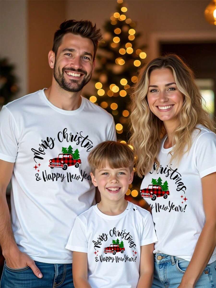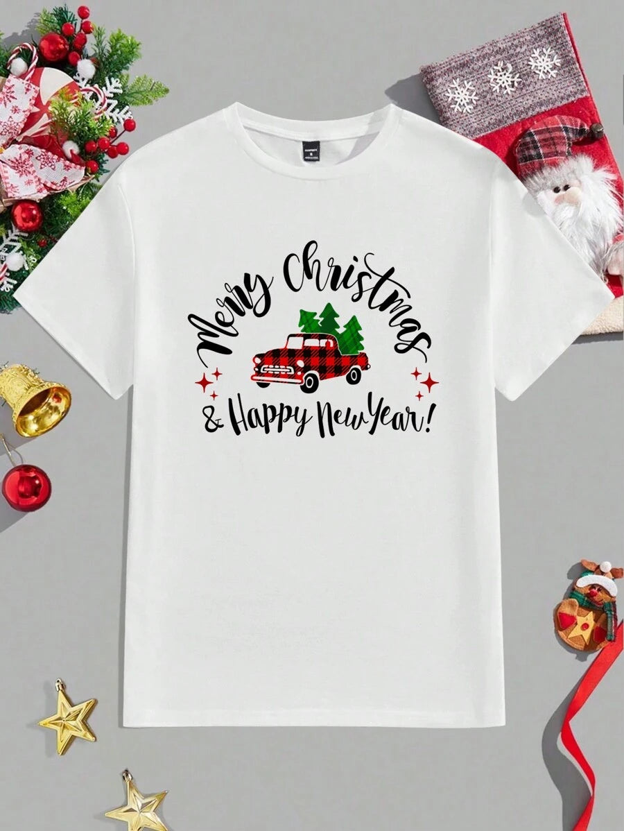 Unisex Biały T-Shirt Świąteczny Krótki Rękaw - Grafika Ciężarówka z Choinką
