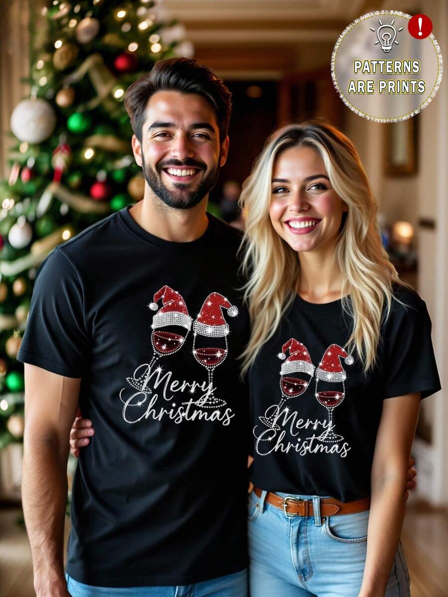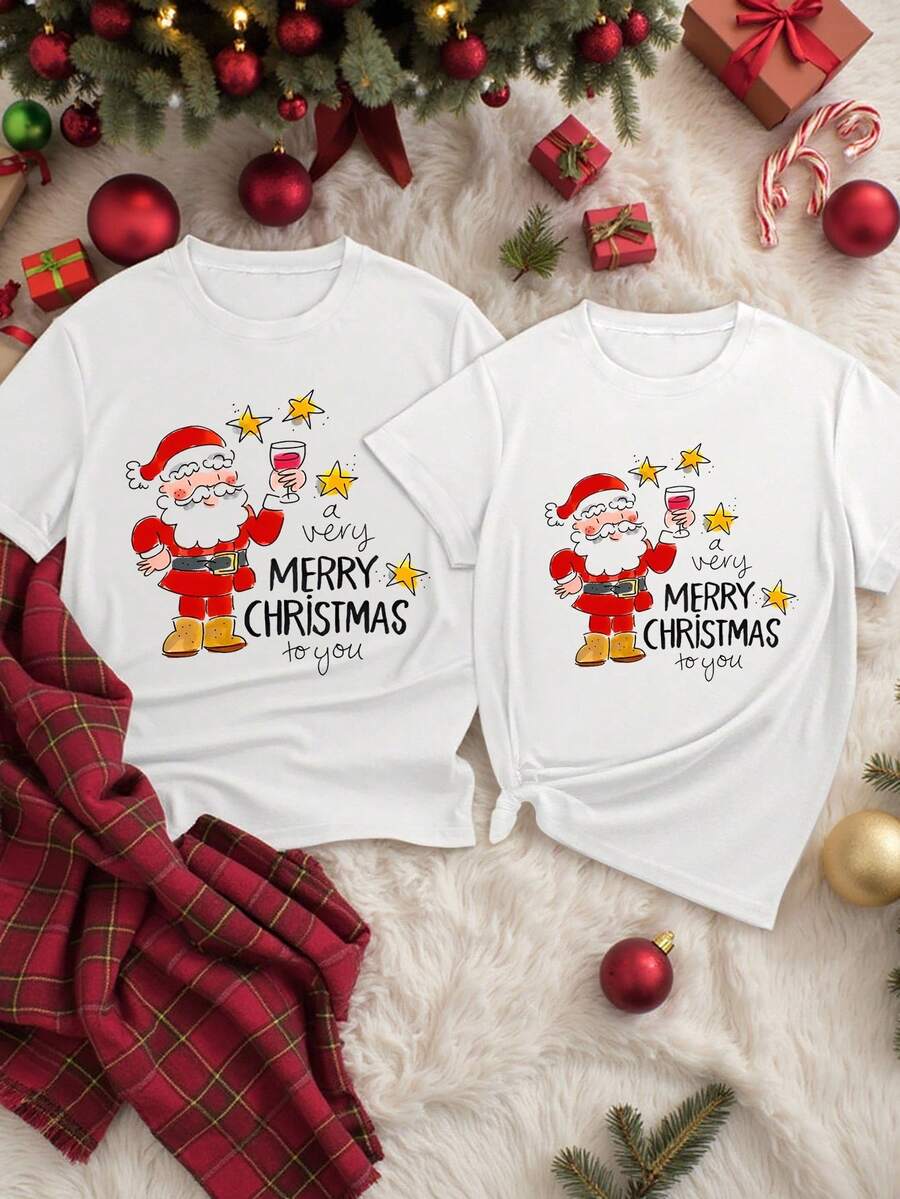 Unisex Koszulka Świąteczna Zestaw - Grafika Santa Pijący Wino Zestaw dla Par