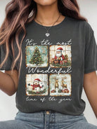 Cofnij się w czasie do najwspanialszego okresu w roku dzięki temu niezwykle uroczemu t-shirtowi. Damska Szara Koszulka Świąteczna natychmiast zapewnia autentyczny klimat retro dzięki wyblakłemu, węglowemu kolorowi i klasycznej, wielopanelowej grafice świątecznej. Ta koszulka, przedstawiająca ukochane świąteczne postacie i wesołe sceny, oferuje swobodny, lekko sprany wygląd prosto z pudełka, co czyni ją idealną dla tych, którzy kochają wygodny, "życiowy" styl. Jej miękki, przestronny krój sprawia, że będzie to Twój ulubiony top do popijania gorącego cydru, pakowania prezentów lub świętowania z rodziną.