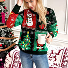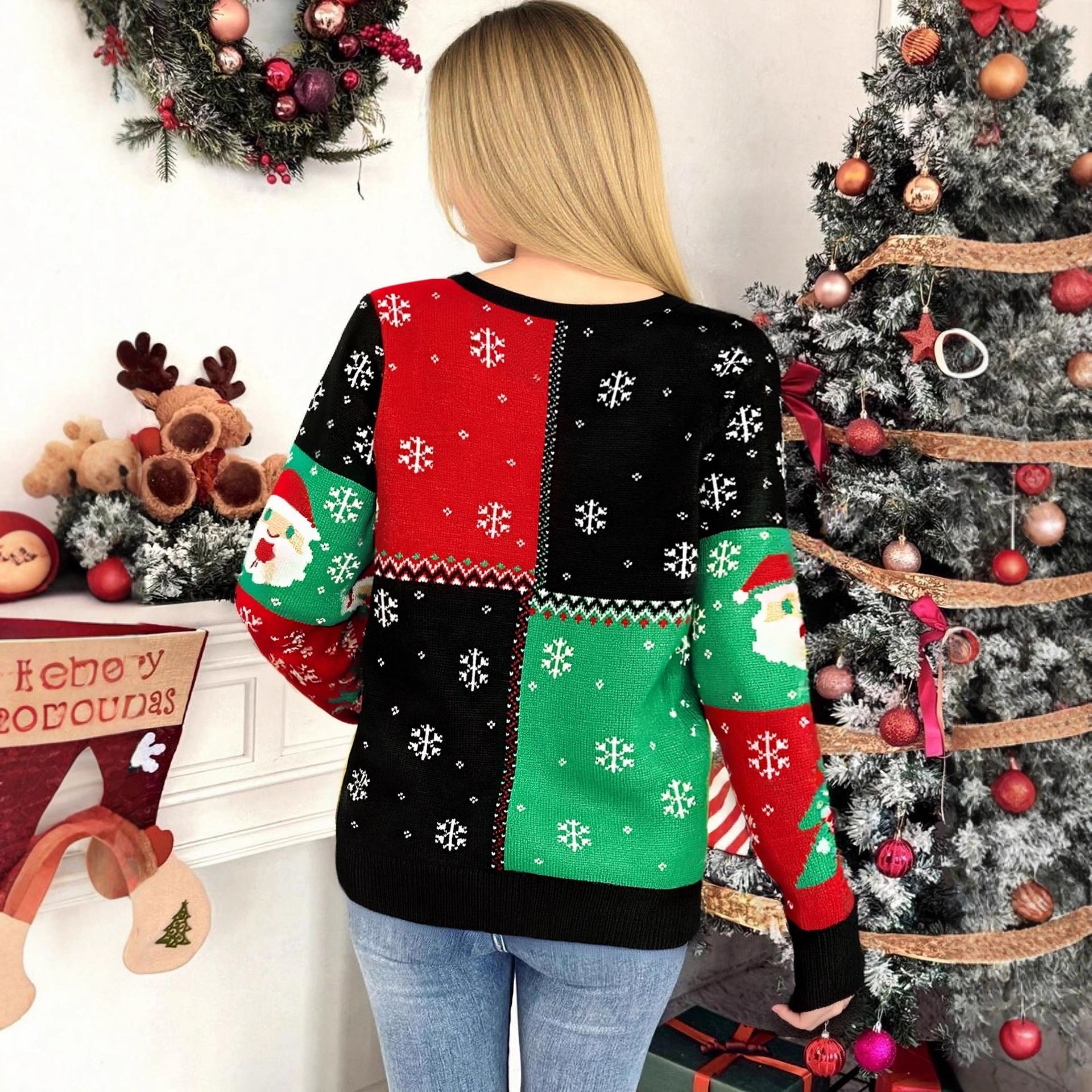 Damski Wielokolorowy Dziany Sweter Świąteczny - Patchwork i Wzór Bałwan/Choinka