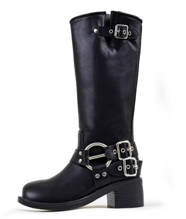 Wkrocz w mocny i charakterny styl z naszymi wyrafinowanymi Damskimi Czarnymi Kozakami do Kolan. Te kozaki to wyrazisty element, zaprojektowany dla nowoczesnej kobiety, która ceni sobie zarówno modę, jak i funkcjonalność. Łącząc elegancką sylwetkę do kolan z praktycznymi bocznymi zamkami ułatwiającymi zakładanie i zdejmowanie, ozdobione są dekoracyjnymi klamrami, które dodają szykownej, inspirowanej motocyklowym stylem estetyki. Stworzone dla pewnego i wygodnego dopasowania, te kozaki są idealne do dodania odrobiny charakteru każdej stylizacji, od codziennych, swobodnych ubrań po wieczorne wyjście.