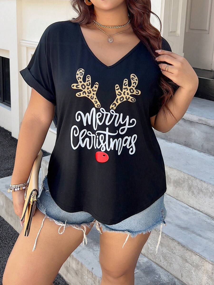 Damska Koszulka Świąteczna - Dekolt V z Rogi Renifera w Panterkę