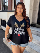 Podnieś swoje codzienne świąteczne stylizacje odrobiną współczesnej elegancji. Damska Koszulka Świąteczna to idealny top dla tych, którzy preferują szykowną neutralność nad jasnymi, tradycyjnymi kolorami w okresie świątecznym. Ta pochlebna czarna koszulka ma stylowy dekolt w kształcie litery V i wygodny, luźny krój, co czyni ją świetną alternatywą dla standardowych stylów z okrągłym dekoltem. Efektowna świąteczna grafika, która zawiera napis "Merry Christmas" i świąteczne elementy (jak poroże renifera i kropki), pięknie wyróżnia się na ciemnym tle. To idealny element, aby dodać sezonowej radości bez poświęcania swojego eleganckiego, nowoczesnego wyglądu.