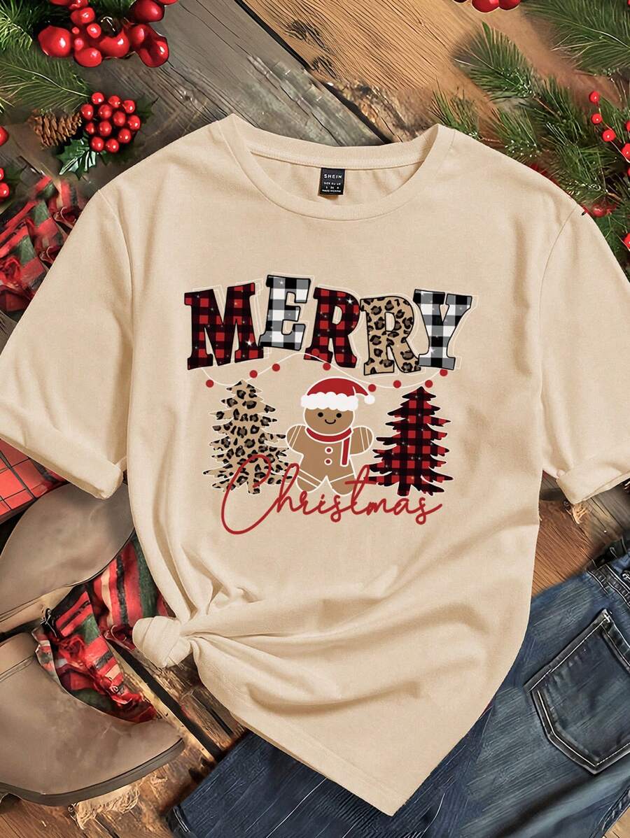 Damska Koszulka Świąteczna - Z Nadrukiem w Kratę i Piernikowym Ludzikiem