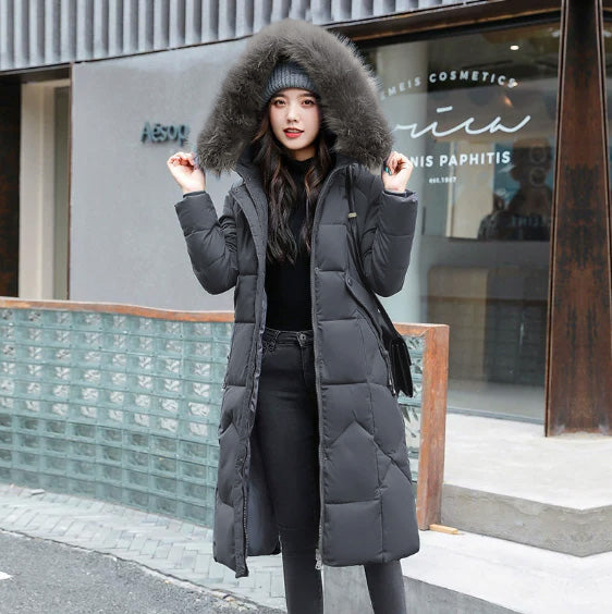 Damski Płaszcz Puchowy Zimowy Maxi - Kaptur i Ozdobne Wykończenie Kołnierza