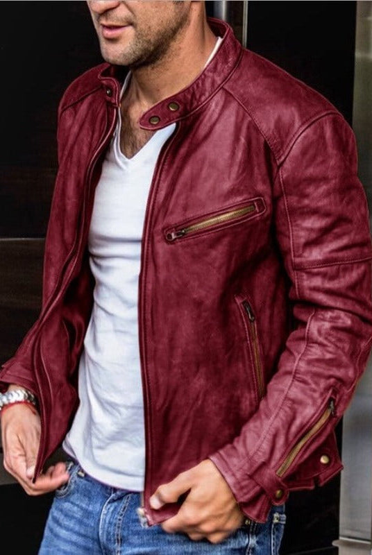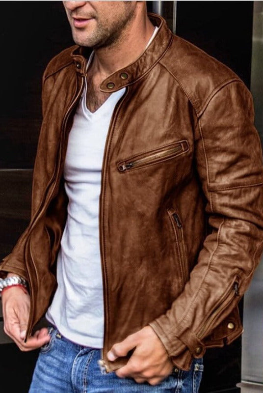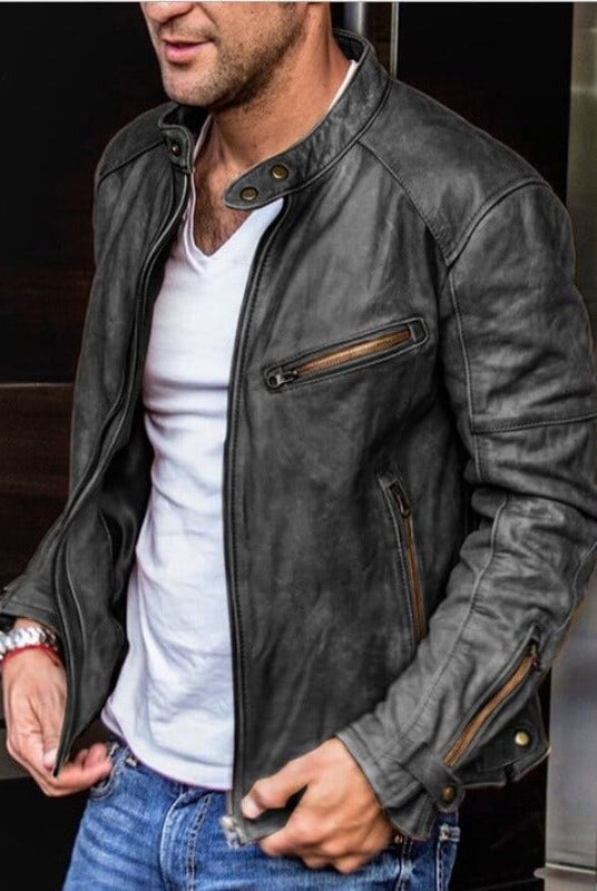 Męska Skórzana Kurtka Ramoneska - Ze Stójką, Zapinana na Zamek